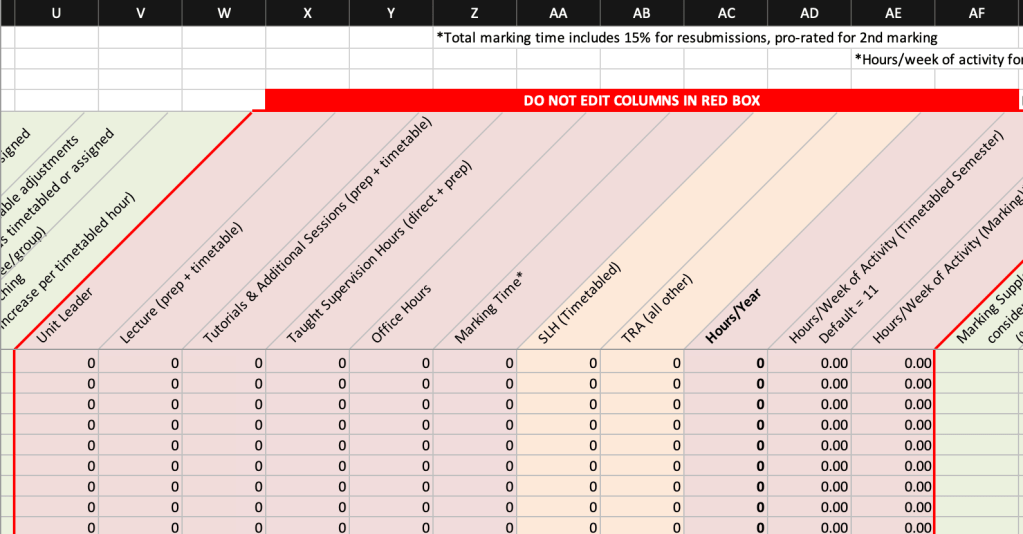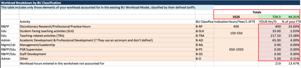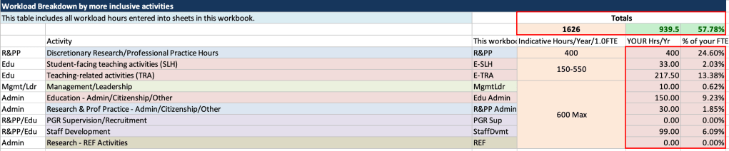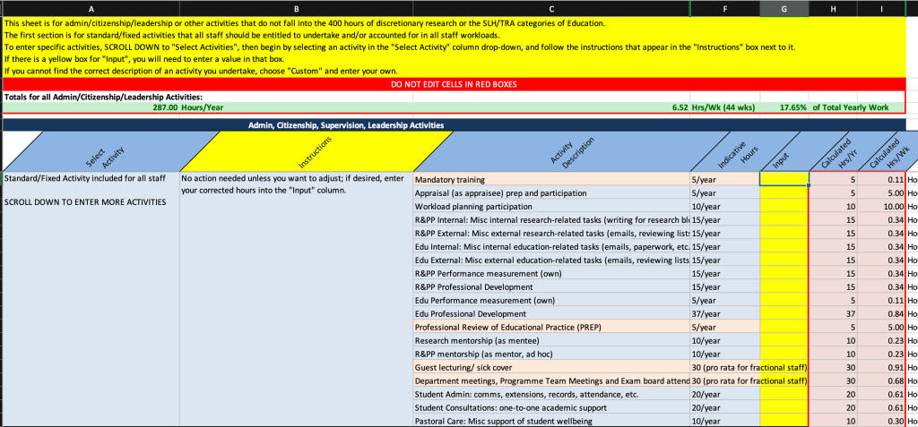 - Top Section: Standard/Fixed activities included with all academic staff workloads in this model.