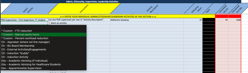 - Note: you can add custom activities that aren’t in the fixed/calculated hours list. Use this for roles/activities you can’t find elsewhere, or to add supplemental hours to a fixed-hours activity.