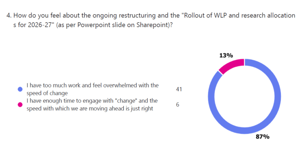 Our WLP survey opened on 23 February and received 47 responses within 24 hours. A key finding was that 87% of respondents felt overwhelmed at the speed of policy and governance change in the university, without sufficient time in their workloads to consider the changes and feed back on them.